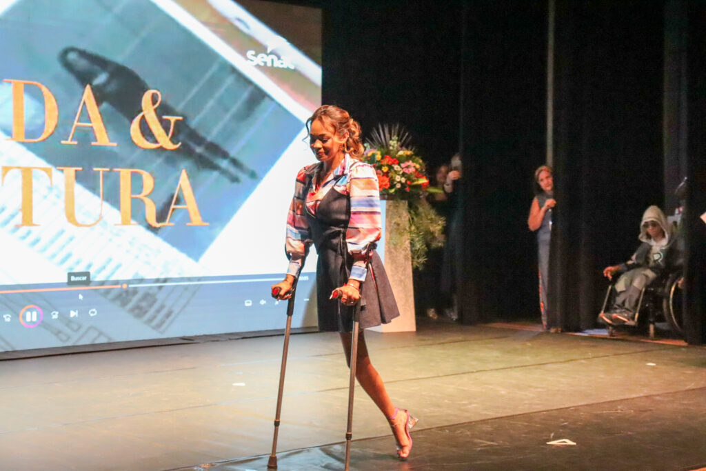 No mesmo dia, os participantes assistiram ao desfile “Moda Inclusiva”, produzido por alunos e instrutores do segmento de Moda do Senac. A coleção apresentada destacou três eixos: roupas adaptadas para pessoas com deficiência física, peças sensoriais para pessoas neurodivergentes e vestuário com referências afro-indígenas e étnico-raciais. As modelagens incluíram zíperes facilitadores, tecidos leves, botões de fácil manuseio e cores pensadas para conforto e bem-estar, evidenciando a aplicabilidade de princípios de acessibilidade na prática profissional.