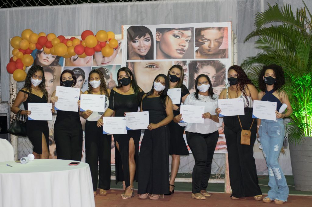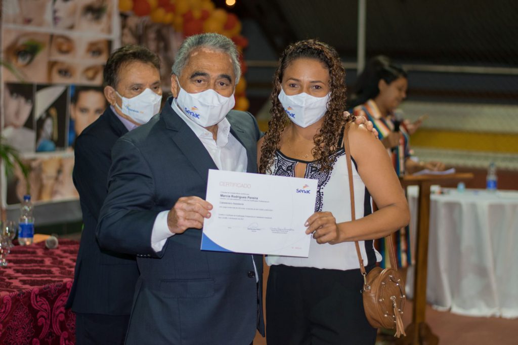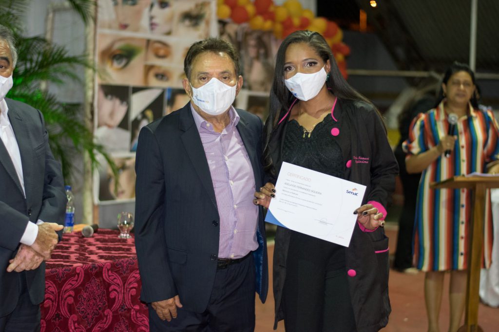 Ela e outros 81 alunos receberam seus certificados de conclusão dos cursos de Maquiador, Cabeleireiro Assistente, Depilador e Manicure e Pedicure, todos realizados no período de novembro de 2020 a julho de 2021, em parceria com a prefeitura de Passagem Franca, responsável por viabilizar o deslocamento da Carreta-Escola de Moda e Beleza do Senac para o município. A solenidade de entrega dos certificados aconteceu na noite de sábado, 10 de julho, na Quadra Poliesportiva Edvaldo Cazé, em evento que seguiu os devidos Protocolos Sanitários estabelecidos no Decreto 36.829, de 02 de julho de 2021, do Governo do Estado do Maranhão.